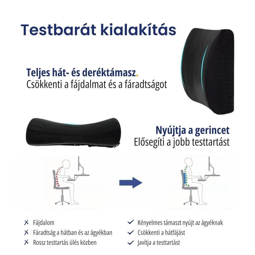 Segít a helyes testtartásban, csökkenti a hát- és derékfájdalmat, valamint tehermentesíti az izmokat a hosszan tartó ülés során.