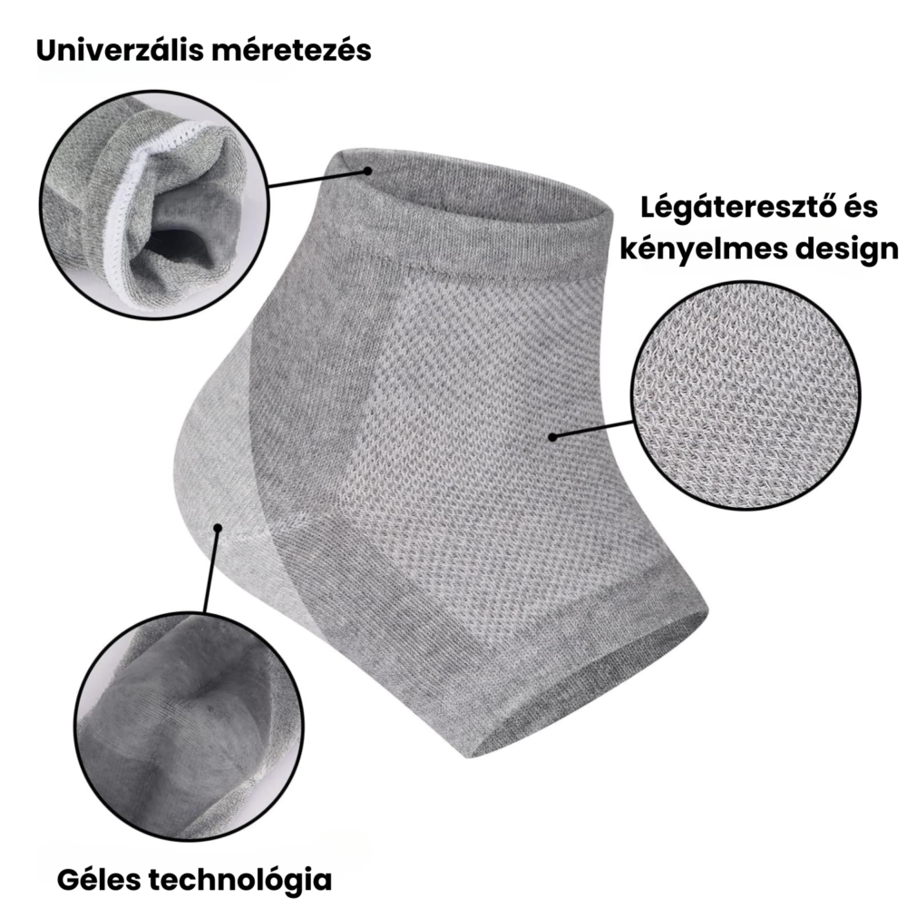A zoknik sarkában található innovatív bélés nedvességmegkötő réteget képez, így biztosítva a folyamatos hidratálást. A gél ezen felül enyhülést nyújt a száraz, irritált sarkaknak.