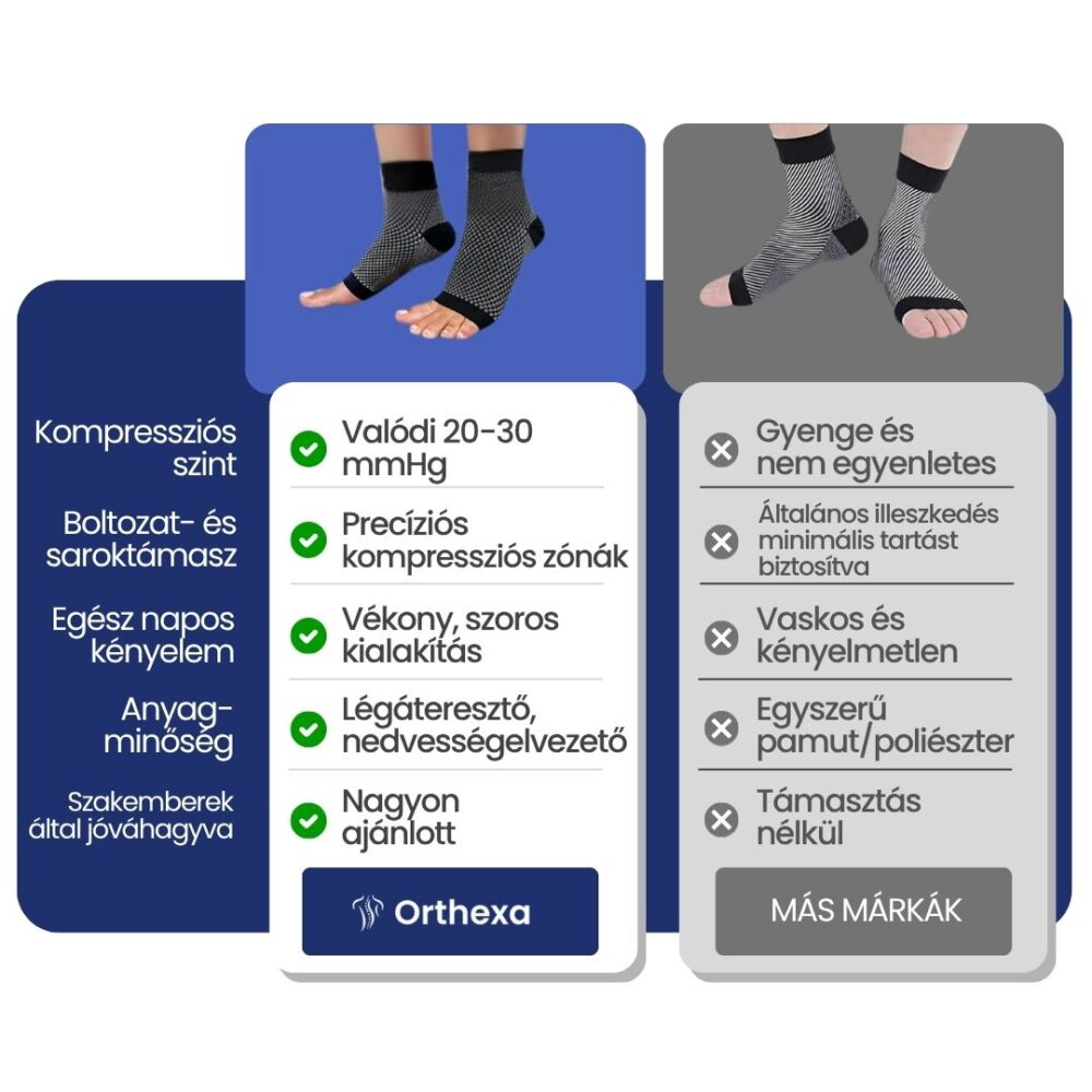 - Fájdalom- és gyulladáscsökkentés – a célzott kompresszió tehermentesíti a talpi bőnyét, a sarkat és az Achilles-ínt.