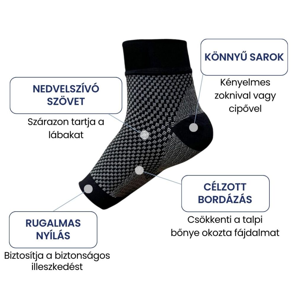 Kompressziós zokni boltív-támasztással, a talpi és sarokfájdalmak csillapítására tervezve. Ideális mindennapi használatra, sportolásra és sérülések utáni felépüléshez.