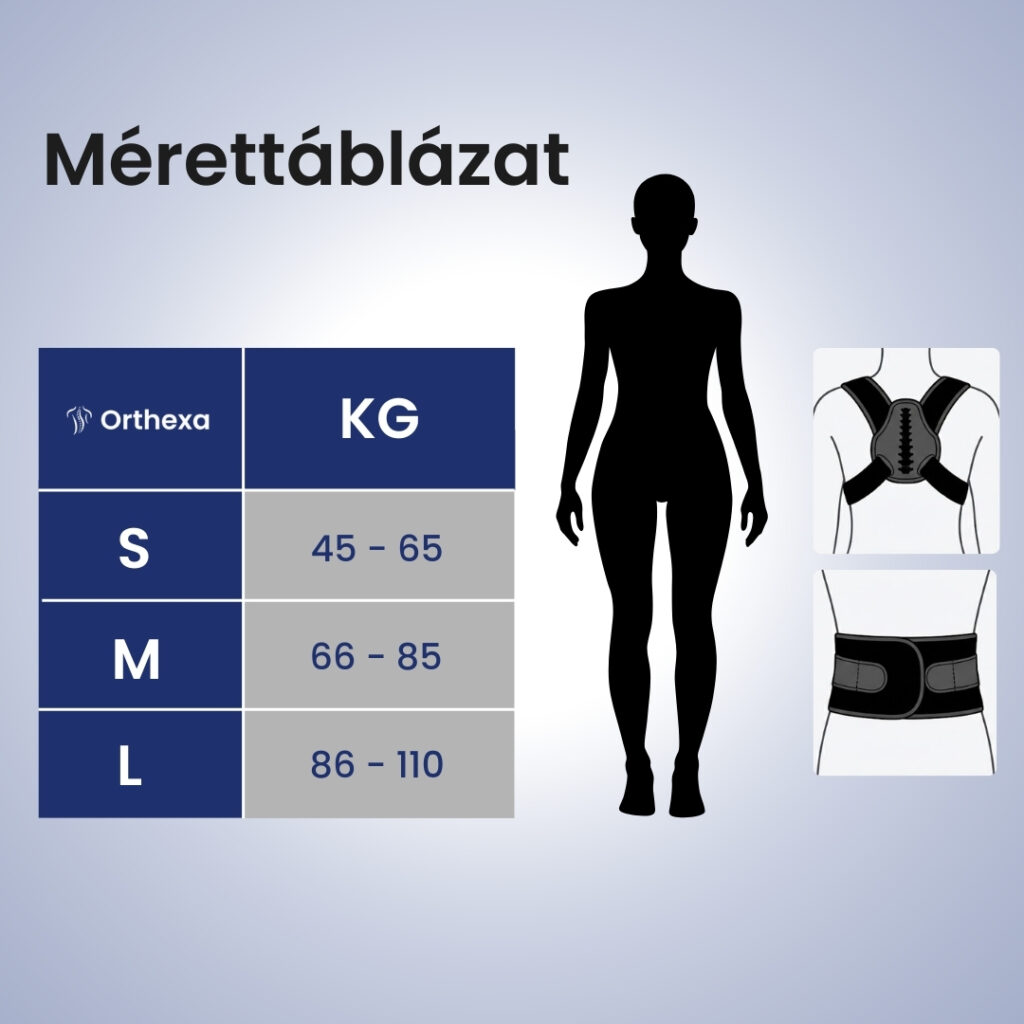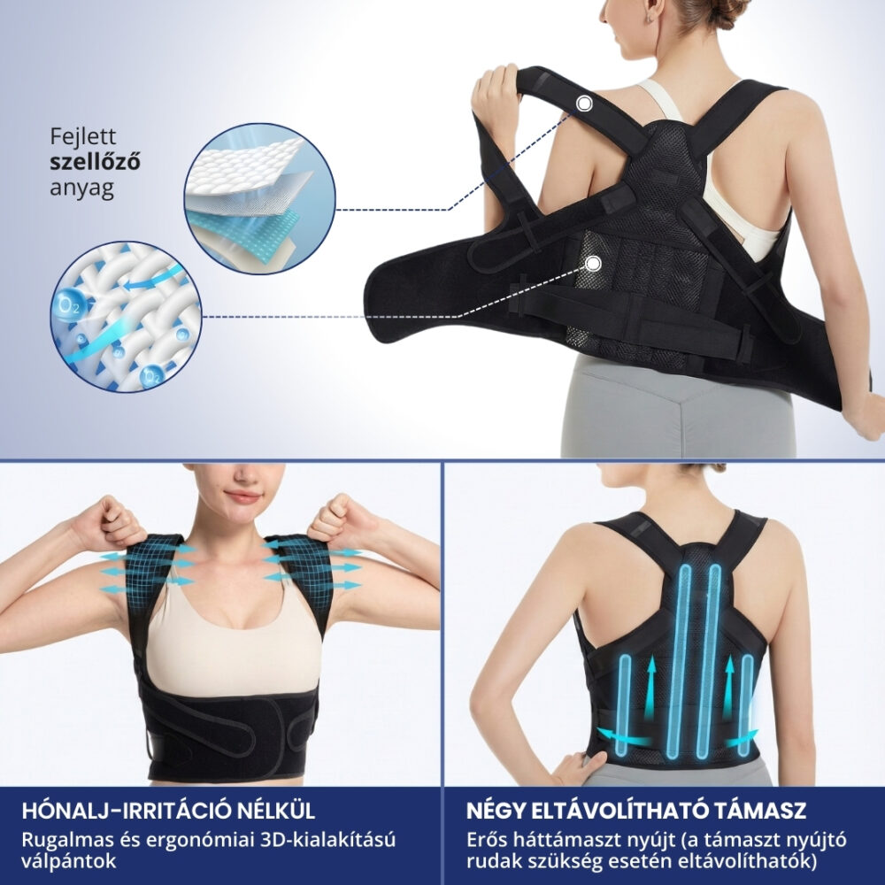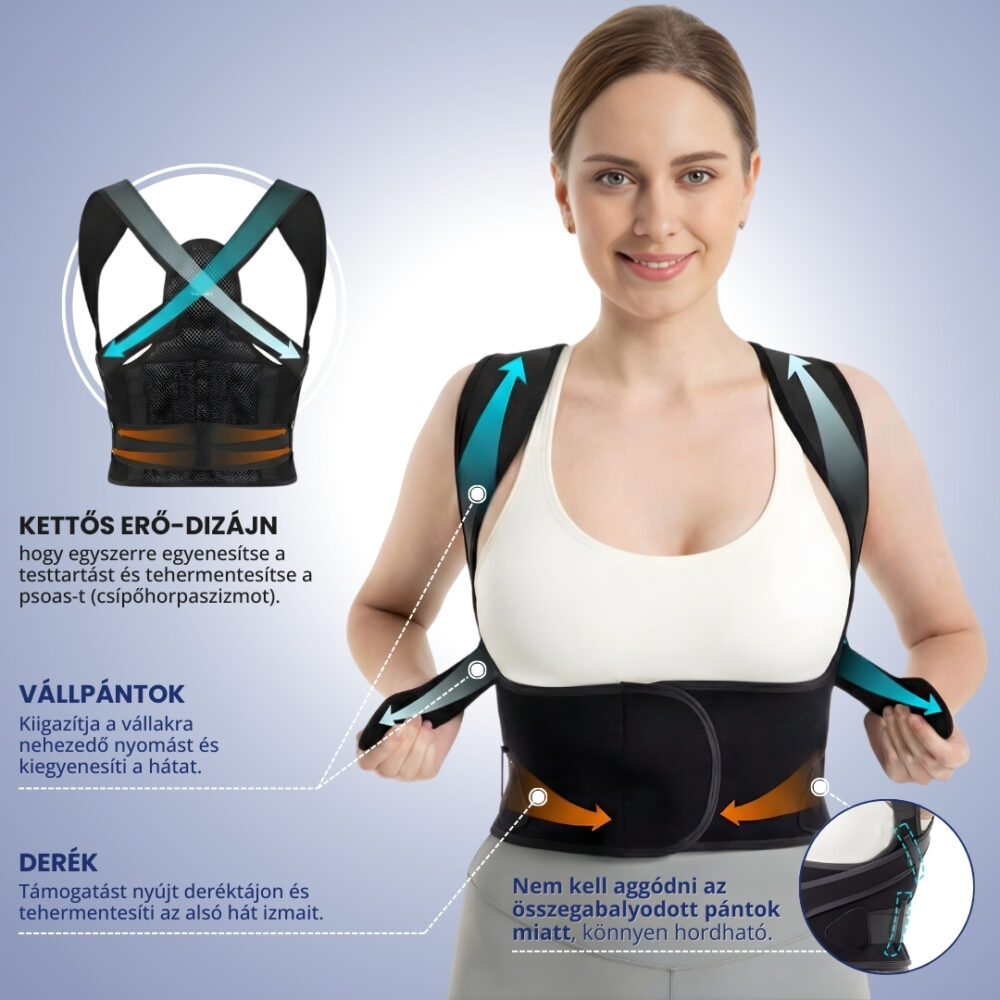 A rugalmas erősítő pánt további támogatást nyújt a deréknak, az ergonomikus kialakítás pedig természetes mozgást és hatékony testtartás-korrekciót tesz lehetővé.