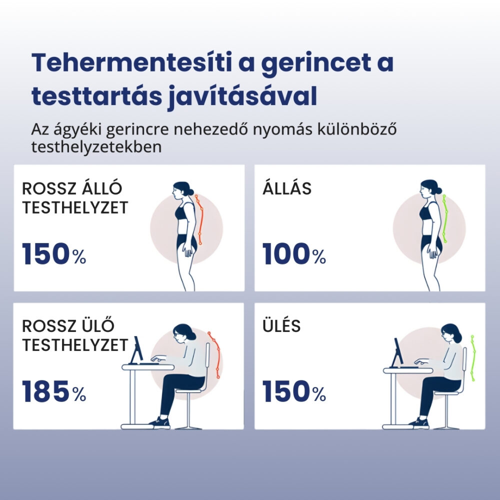 Deréktámaszként is működik, mivel alátámasztja a gerincet és csökkenti a deréktájra nehezedő terhelést hosszan tartó ülés vagy állás közben. Az eredmény: kevesebb feszültség és jobb közérzet.